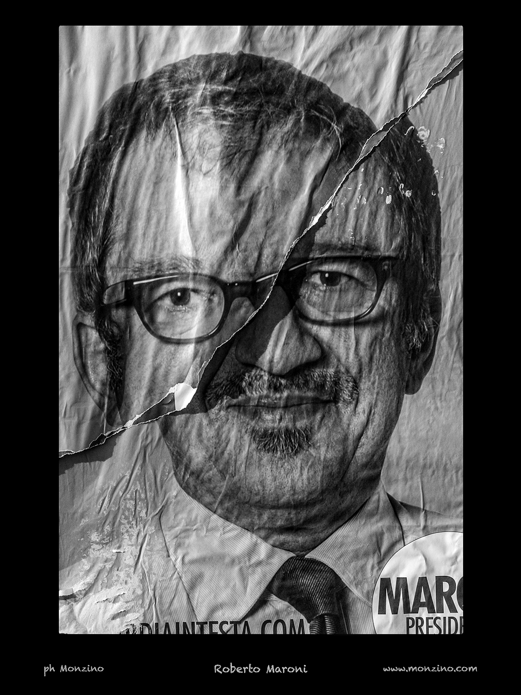 Maroni: l’intuizione di Monzino ne fa un’icona jazz, un lampo di ironia, la curva di una attività politica intensa, simboleggiata nello strappo del manifesto. Voluto da Maroni o dall’artista? Lo strappo sta a raffigurare due personalità, una pubblica e l’altra più leggera che deve rimanere privata?