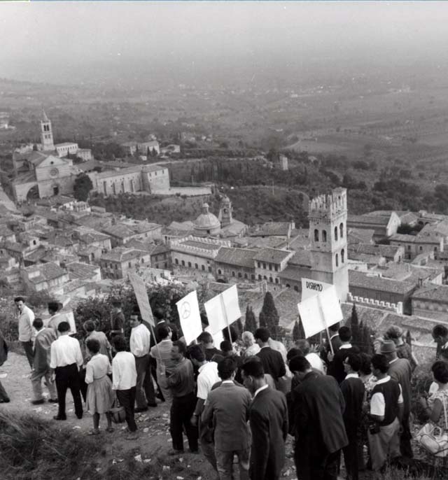 Il suo pensiero consolidatosi con gli studi e con le attività del dopo guerra, nel quadro internazionale della guerra fredda e del timore di una minaccia nucleare, portarono Capitini a ideare la prima Marcia della Pace PerugiAssisi. Essa ebbe luogo il 24 settembre 1961, a poche settimane dalla costruzione del muro di Berlino, e in questa occasione sventolò per la prima volta la ormai comune bandiera arcobaleno della pace. Come in tutte le successive marce, si partì dai Giardini del Frontone, adiacenti alla chiesa di san Pietro di Perugia, per arrivare alla Rocca di Assisi, con un percorso di circa 24 chilometri. A maturare l’iniziativa del 1961 contribuì anche il successo del raduno antinucleare di pacifisti anglosassoni tenuto a Andermaston nel 1958, e guidato dal filosofo Bertrand Russel.