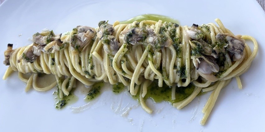 Fresco e saporito il Tonno in cottura tataki, laccato al miele di acacia con salsa al cetriolo e neve di cocco. Grande classico elaborato con classe e tecnica la Chitarrina alle vongole veraci e olio aromatizzato alle erbette di campo. Saporito e ben cotto il Merluzzo viola con ortaggi croccanti.