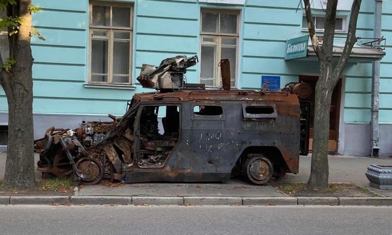 Ogni giorno andando al lavoro passo davanti a mezzi militari dei rascisti distrutti e bruciati. Sono esposti nel cuore della capitale dell’Ucraina – a Kiev – ad un centinaio di metri dal Parlamento ucraino e non lontano dall’Ufficio del Presidente. Questo è vicolo Kryposnyi: c’è un carro armato rotto, vari veicoli militari, una coda mozzata di un caccia rascista Sukhoy-24. Spesso ci sono anche fiori all’angolo di questa strada. Questi non sono fiori per soldati caduti. Questi sono fiori per i manifestanti che sono stati fucilati proprio qui durante la Rivoluzione della Dignità, di Maidan nel 2014.
