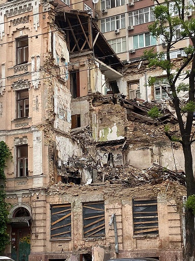 Via Zhylianska: cominciò ad essere costruita negli anni ’50 del XIX secolo. Tra i monumenti architettonici si notano gli stili neoclassico, moderno e rinascimentale fiorentino. Un tempo vivevano qui famosi attori, artisti, scrittori, personaggi pubblici. Ora ci sono rovine in via Zhylianska. Durante uno degli attacchi a Kyiv da parte dei droni kamikaze russi nell’autunno del 2022 è stato distrutto un edificio storico costruito circa 120 anni fa. In quell’alba di ottobre, a seguito dell’esplosione, furono uccisi cinque abitanti di Kyiv, tra cui una giovane coppia… la donna era incinta… 19 persone furono salvate dalle macerie. Nella capitale ci sono tantissimi memoriali, monumenti, gruppi scultorei, targhe e figure commemorative, la maggior parte dei quali si trova nella parte storica della città. Ora non si vedono, sono nascosti dietro sacchi di sabbia e pannelli protettivi. Mi sono ricordata del primo massiccio attacco missilistico della Russia contro l’Ucraina. Era il 10 ottobre 2022.