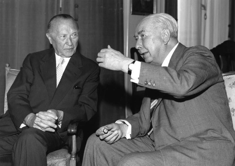 Risale a Theodor Heuss, primo presidente della Repubblica Federale di Germania, e al 1950, il riconoscere che la civiltà occidentale, così come il costituendo progetto europeo, poggiano su tre colli: l’Acropoli di Atene, il Campidoglio di Roma, e il Golgota, e che i tre colli devono costituire un unico riferimento. La foto qui accanto ritrae Theodor Heuss insieme al cancelliere Konrad Adenauer, uno dei padri fondatori dell’Europa del secondo novecento, forse la più significativa edificazione della ricostruzione postbellica.