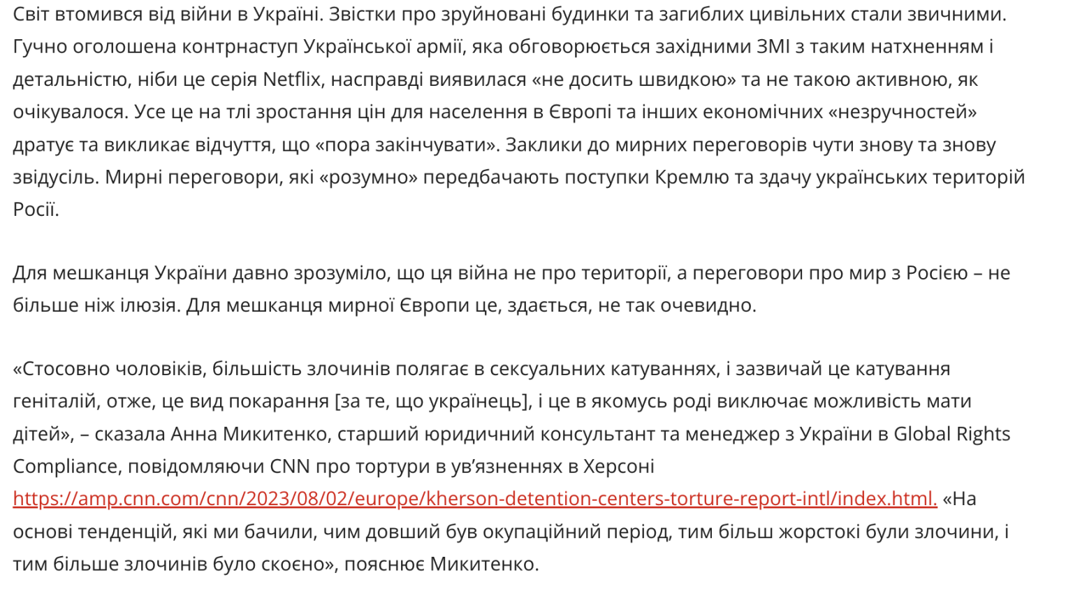 Світ втомився від війни в Україні. Звістки про зруйновані будинки та загиблих цивільних стали звичними. Гучно оголошена контрнаступ Української армії, яка обговорюється західними ЗМІ з таким натхненням і детальністю, ніби це серія Netflix, насправді виявилася «не досить швидкою» та не такою активною, як очікувалося. Усе це на тлі зростання цін для населення в Європі та інших економічних «незручностей» дратує та викликає відчуття, що «пора закінчувати». Заклики до мирних переговорів чути знову та знову звідусіль. Мирні переговори, які «розумно» передбачають поступки Кремлю та здачу українських територій Росії.