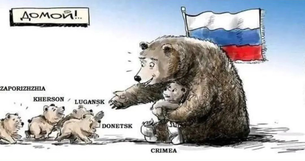 “ДOMOЙ! CASA! L’orso russo accoglie a casa i quattro oblast del Donbass Donetsk, Lugansk, Kherson e Zaporizhzhia” di Erdonzello – Public Domain Mark 1.0.
