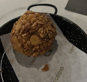 Ovviamente in piena tradizione partenopea si comincia con i fritti, tra i quali spicca lo straordinario AGLIO E OLIO CROCCANTE, una Frittatina di spaghetti con aglio orsino, olio, peperoncino, prezzemolo e besciamella con croccante panatura di nocciole, mandorla, pistacchio, noci. Il sapore dell’aglio è preciso e nitido, segno di una preparazione perfetta.