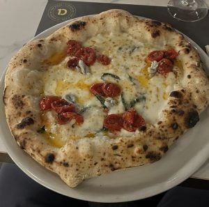 Personalmente ho assaggiato la 4 CASI CAMPANI con Caciocavallo podolico, Blu di bufala, Pecorino Carmasciano, fior di latte di Agerola, pomodorini semisecchi, crumble multicerali (non invasivo), basilico riccio napoletano e olio di sedano. Semplicemente straordinaria!