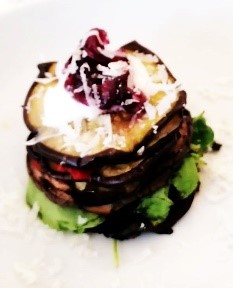 Parmigianina fredda di melanzane con stracciatella e cipolla in agrodolce.