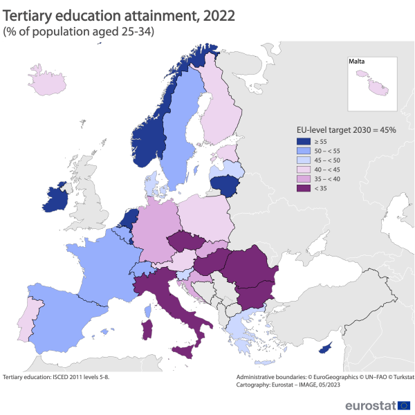 Non sorprende, visto i ritardi sopra citati, che in Italia il tasso di giovani (fra i 25 e 34 anni) che abbiano conseguito la laurea sia fra i più bassi (vedi Fig.1) in Europa. Abbiamo effettuato un miglioramento, la percentuale di laureati sul totale dei giovani, è passata dal 21,1% nel 2011 al 29,2% nel 2022; ma restiamo ancora lontani dalla media EU-27 che nel ’22 era pari al 42,2% e certo non saremo in grado di centrare l’obiettivo per UE 2030 di avere almeno 45 laureati su 100 cittadini.