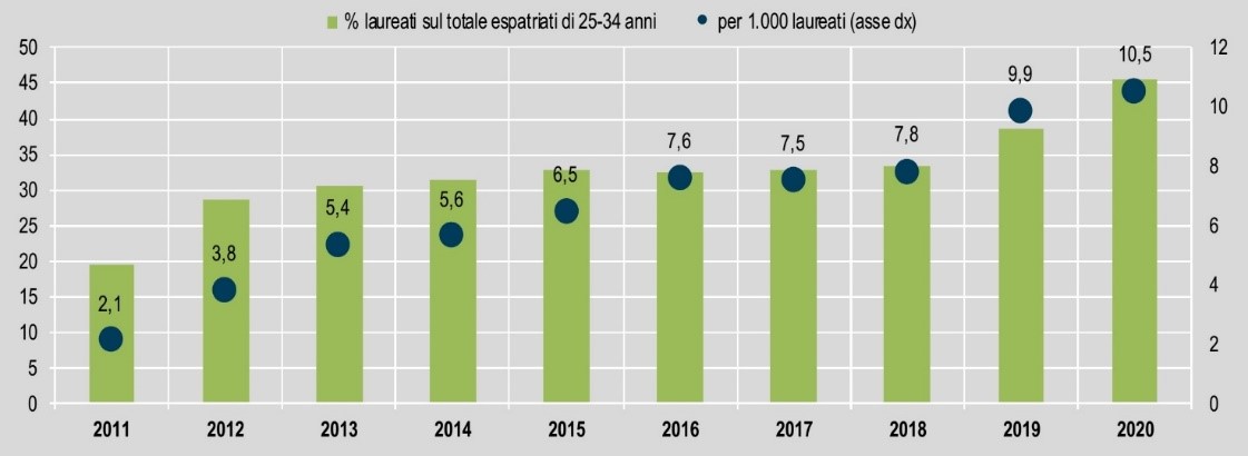Nella Fig. 2 vediamo che, nei dieci anni considerati (2011-2020), è progressivamente aumentata la percentuale di laureati che hanno deciso di espatriare (passando dal 2 a più del 10 per mille). È anche aumentata la percentuale dei laureati sul totale dei giovani espatriati, passando dal 20% a più del 45%. Come ricorda il recente Rapporto Annuale 2023 ISTAT: “la meta preferita dai giovani laureati italiani è il Regno Unito. Nel triennio 2019-2021, questo Paese ha accolto circa un quarto dei flussi dei giovani espatriati tra i 25 e i 34 anni in possesso di almeno la laurea, seguito da Germania (13%), Francia (9%) e Svizzera (8%)”.