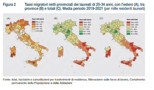 Vi è poi un altro aspetto molto grave per il sistema paese: la migrazione interna ha, dal dopoguerra, una costante direzione dal Sud e le Isole del Paese verso il Centro ed il Nord. È un fenomeno storico che non si riesce a fermare, per la colpevole ignavia del mondo politico negli ultimi decenni e per problemi endogeni quali le mafie e la corruzione. Nella Fig. 3 è impressionante vedere come l’esodo di laureati verso l’estero ha dimensioni simili fra le provincie italiane, mentre i tassi migratori interni Sud verso Nord invertono, almeno in parte, il bilancio sfavorevole dovuto alle emigrazioni verso l’estero per le provincie settentrionali. Questa situazione (mappa a destra della Fig. 3) permette che i laureati che vanno in regioni del Centro e del Nord siano un contingente che rimpiazza le carenze dovute ai laureati espatriati e offre un positivo impulso alle regioni più produttive, a detrimento di quelle già meno sviluppate del Meridione.