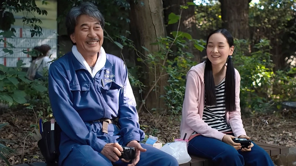 Hirayama (l’attore è Kōji Yakusho, Palma per l’interpretazione a Cannes) è un sessantenne che per lavoro pulisce i bagni pubblici, a Tokio. Lo fa da anni (non sappiamo quanti e perché) con una cura e uno scrupolo esemplari, da “operatore sanitario” dei bagni pubblici. Se la cosa, in contesto giapponese e in ambito molto meno tecnologico, vi fa un po’ pensare alla storia dello zen e della manutenzione della motocicletta, sappiate che il raffronto non è poi così pittoresco o sbagliato (vedremo perché). Ma se vi fa ridere o vi muove a compassione, invece, siete davvero fuori strada. Hirayama non è povero. Pochi cenni durante il racconto dicono di una famiglia borghese alle spalle, di una vedovanza, di una sorella benestante (per matrimonio ma non solo), di un difficile rapporto col padre in fin di vita, di una cultura raffinata: letteraria (Faulkner, Highsmith) musicale (quella americana di un uomo della sua età: Lou Reed, Eric Burdon, Nina Simone, Patty Smith, ecc.). Abita una camera con bagno e poco più, in un edificio dall’aria fatiscente. Ma la sua vita è tutt’altro che miserabile. La stanza è arredata con gusto e pulitissima. Libri alle pareti, apparecchio musicale, piantine sul balcone, ottima cura della persona. Una grande vetrata sulla città, davanti alla quale ogni sera srotola il suo futon (l’alto materasso a terra dei giapponesi) e ogni mattina lo riarrotola, una lampada per leggere prima di dormire.