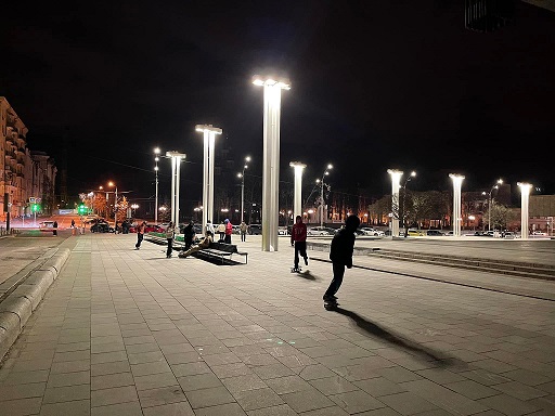 È tarda sera, un’ora prima del coprifuoco, Sumska [via centrale di Kharkiv]. Mi fermo e guardo i ragazzi. Davanti al Teatro dell’Opera, nello stesso posto dove lo facevano, circa trent’anni fa, altri adolescenti – i loro padri – questi ragazzi stanno facendo skateboard freestyle. Un’ora prima del coprifuoco, nell’inverno del 2024.