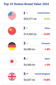 Ad esempio, il valore del marchio statunitense ammonta a ben 32.271 miliardi di dollari ed è ancora in crescita. Quello cinese ammonta a 19.960 miliardi di dollari, quasi la metà, e in calo.