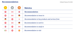 - L’anno peggiore per la Germania: per la prima volta, è scivolata così precipitosamente da riuscire a malapena a raggiungere la top 5. Scommetterei la sua posizione vacillante su questioni spinose e la guerra, insieme a una percepita mancanza di forza di volontà risoluta, sta avendo il suo pedaggio. Per inciso, ricordando la recente retorica bellicosa della leadership francese, prevedo che la nazione salirà di livello l’anno prossimo se manterrà questo atteggiamento combattivo.