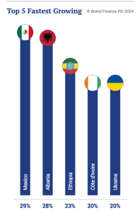 L’Ucraina rimane una delle 5 nazioni in più rapida crescita in termini di riconoscimento e influenza, anche se la sua ascesa ha leggermente rallentato.