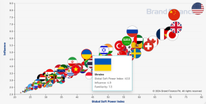 All’inizio del 2023, l’Ucraina aveva scalato ben 14 posizioni nella classifica del soft power (abbastanza significativa rispetto allo slancio di altre nazioni) fino al 37° posto. L’anno scorso ha ceduto 7 posizioni al 44° posto su 193 paesi. Tuttavia, occupa la posizione più alta tra tutti gli ex stati sovietici, nazioni con scarsa esperienza di indipendenza e di coltivare i propri marchi.