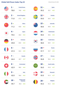 Nel frattempo, la Russia, che occupava la 13a posizione all’inizio del 2023 prima di perdere 4 posizioni a causa della guerra, è scivolata ulteriormente al 16° posto lo scorso anno, ma mantiene un’influenza abbastanza potente sulla scena globale.
