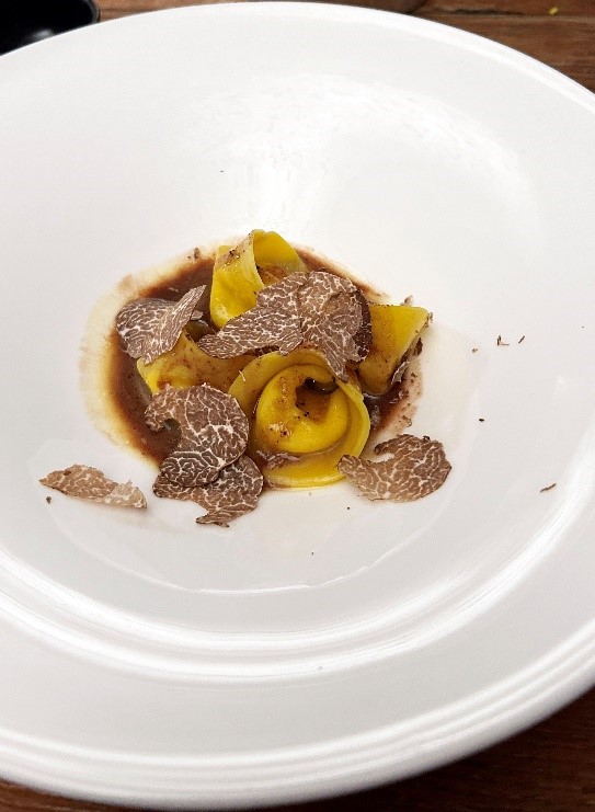 Nel 2017 lo chef si è cimentato con i Tortelli 40 tuorli all’amarena, parmigiano e tartufo in fondo bruno: semplicemente straordinari con tanto di lamelle di bianchetto umbro.