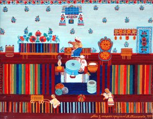 Guardando i dipinti di Marfa Tymchenko, ci sembra di sfogliare pagine autobiografiche che svelano il mondo in cui viveva. Possiamo trovare una riproduzione dettagliata della decorazione interna, straordinariamente bella della casa dove nacque la futura artigiana. La stufa è l’elemento funzionale principale della casa ucraina, e quindi è sempre decorata con disegni, nastri di carta con ornamenti. La mamma li rinnovava sempre per Natale e Pasqua, acquistandone di nuovi in occasione delle tradizionali fiere di Petrykivka (“Io con la mamma in fiera”) famose da quelle parti. Le pareti della casa erano decorate con asciugamani, copriletti e cuscini sapientemente ricamati dalla madre, che era una delle migliori ricamatrici di Petrykivka, e il pavimento era completamente ricoperto di tappeti variopinti realizzati sempre dalla madre, che non si trovavano in altre case (“Lavoriamo insieme, io e la mamma”). Capitava spesso che i bambini guardassero dalle finestre per ammirare la decorazione colorata della loro casa.