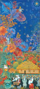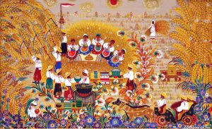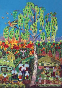 La rinomata artista ucraina Marfa Ksenofontivna Tymchenko (1922-2009) aveva il titolo onorario di Pittore popolare dell’Ucraina, è stata vincitrice dei più alti premi d’arte dell’Ucraina. Nel corso di tutti i 70 anni della sua vita creativa ha sviluppato uno stile ornamentale unico, creato da generazioni di artigiani del suo antico villaggio natale di Petrykivka, nella regione di Dnipropetrovsk, che riflette lo stile barocco ucraino. Una delle migliori rappresentanti della scuola di pittura decorativa di Petrykivka, Marfa Tymchenko, che ha vissuto e lavorato a Kyiv sin dalla giovane età ricevendo immancabilmente riconoscimenti per il suo straordinario talento in numerose mostre in Ucraina.