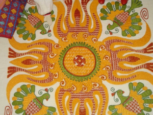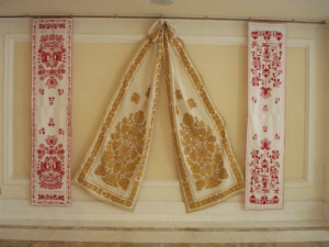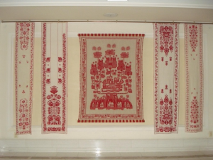 Una parte della collezione di ricami del fondo museale meritava una particolare attenzione. Comprendeva la collezione di asciugamani tradizionali ricamati per matrimonio (60 opere), abiti tradizionali ucraini provenienti da diverse regioni dell’Ucraina (20 per donne, 20 per uomini), ricostruzione di copricapi (10), pannelli decorativi ricamati tematici per interni pubblici moderni (circa 60), collezioni di abbigliamento per ragazze, bambini e ragazzi. Tutte le opere erano realizzate a mano e per crearle è stata necessaria un’enorme quantità di tempo. I vestititi e i tessuti ricamati decoravano centri espositivi, gallerie e sale museali, venivano creati progetti che rivelavano le ricerche artistiche formate sulle basi della scuola di Mykhailo Boychuk. La collezione del fondo museale non aveva analoghi, era unica.
