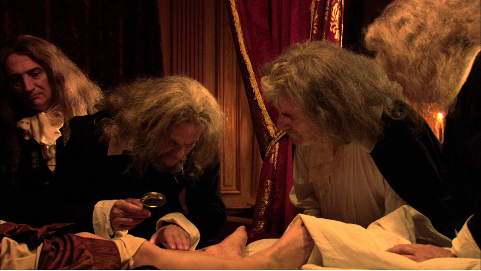E poi la corte: il primo valletto di camera Blouin, gli ingegneri, i consiglieri, i medici Maréchal, oltre a Fagon. Altri se ne aggiungeranno, chiamati dall’Università di Parigi. Tutti più o meno come gli evocati, da Fagon, medici di Molière: purghe, improbabili pozioni e soprattutto salassi. Nessuno, se non troppo tardi, diagnosticherà la cancrena e nel dubbio se amputare o no il male farà il suo corso, fra pensose manipolazioni e pietose applicazioni di unguenti, in un infinito strazio. Da Marsiglia arriva anche uno strano, chiacchierato anti-medico, il dottor Le Brun, che vanta un rimedio infallibile e segreto all’impotenza della medicina “ufficiale”: una miracolosa pozione di “sperma e sangue di toro e grasso di rana”. Schifosissima, accompagnata e giustificata da brillanti circonvoluzioni dialettiche sulle stelle, i pianeti e la linfa vitale. Bevuto l’intruglio, il Re troverà, con le ultime forze, il fiato sufficiente per farlo arrestare. Ma non è che gli altri fossero molto meglio: quello era lo stato della medicina a disposizione dell’uomo forse più potente del mondo. Stessa cosa per l’igiene: anche a Corte, spiegano gli annalisti, le abluzioni avevano la periodicità delle eclissi di sole. Fra interessati consiglieri che cercano di ottenere l’ultima regale apertura di borsa per un’opera faraonica all’imbocco del porto di Roche, brevi pause per la messa o per una riunione con i ministri, cardinali convocati per l’estrema unzione e poi revocati (provvederà il fedele padre Tellier), il monarca berrà fino alla feccia il calice di una straziante agonia.