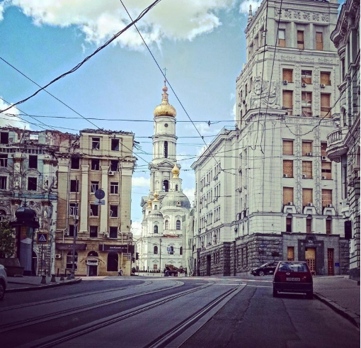 Primavera 2024 Duomo al centro di Kharkiv; a sinistra edificio sventrato da un missile russo