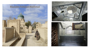 Tra i Mausolei senza dubbio il più suggestivo è quello di Pahlavon Makhmud, uno dei monumenti più antichi di Khiva, che risale al 1362 ed è dedicato a un celebre maestro sufi del tempo e profeta, elevato a Santo Patrono della città. La leggenda narra che abbia aiutato un sovrano e che gli sia stato chiesto cosa volesse in cambio. Lui chiese di far rilasciare i propri connazionali in carcere tanti quanti ne potesse contenere una pelle di mucca e accettata la sua richiesta, tagliò la pelle in strisce sottili per ottenere una cintura molto lunga e con questa astuzia ne salvò molti. L’interno del Mausoleo è interamente decorato con piastrelle a fasce bianche e azzurre, il soffitto e le volte sono ornati con motivi geometrici complessi che accrescono la sensazione intensa di trovarsi in un luogo sacro.