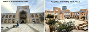 La Madrasa di Muhamad-Amin-khan, costruita tra il 1851 e il 1854 sotto il regno di Mohammed Amin Khan, è considerata la più grande dell’Asia centrale, e poteva ospitare 260 studenti. Da quindici anni è stata trasformata in un suggestivo hotel (vi ho soggiornato come in una favola in una delle celle che ospitavano gli studenti della scuola coranica, con balcone sul cortile interno). È grandiosa, coronata da cinque cupole agli angoli e con l’esterno interamente decorato da maioliche colorate e mattoni smaltati,