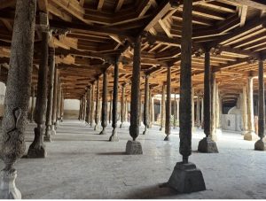 Si dice che un tempo a Khiva ci fossero più di 100 moschee, a conferma dell’importanza religiosa che questa città aveva in passato. Ma la Moschea Juma ovvero del venerdì (jameh) è un edificio religioso particolare, e non ha analoghi in tutta l’Asia centrale. Originaria del X secolo, (ultima ricostruzione datata 1788) ) ha una struttura architettonica tipicamente arcaica con un soffitto piatto su 218 colonne in legno intarsiate con il motivo floreale tipico di Khiva e livellate dalle basi di pietra (ne rimangono in realtà solo una dozzina originali, nei secoli quelle ammalorate sono state sostituite con copie perfette). Entrando si ha impressione di camminare in una foresta e l’ambiente creato per la preghiera è decisamente unico. Una curiosità: tra il piedistallo di pietra e la colonna di legno è stato inserito in tempi recenti un oggetto metallico e cilindrico, al cui interno si trova della lana di cammello utile per prevenire i danni dell’umidità, impedire alle termiti di raggiungere le colonne e per assorbire in parte le scosse di un eventuale terremoto.