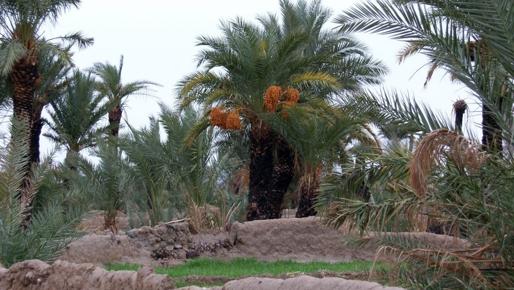 Il flusso d’uscita del qanat viene riversato in una vasca che, come abbiamo direttamente visto e ci è stato raccontato, è utilizzata per lavare i panni la mattina e le stoviglie dopo pranzo. Quando i lavaggi sono terminati, l’acqua viene lasciata fluire nel canale che è comune per tutti i contadini. Il canale si collega ad una rete di stretti canali che si diramano verso i campi coltivati; ciascun contadino si occupa di far sì che l’acqua raggiunga la propria terra da irrigare per un breve periodo di tempo assegnato, poi tocca al contadino del campo vicino di poter utilizzare l’acqua. Per deviare l’acqua in una o l’altra delle diramazioni si usano, ad opera degli interessati, vari sacchetti di pietrisco che vengono posti a mo’ di piccola diga per indirizzare opportunamente il flusso nel proprio campo. Nelle aree irrigate si coltivano cereali, ortaggi, frutta, con particolari eccellenze nell’ambito della produzione di pistacchi e datteri.