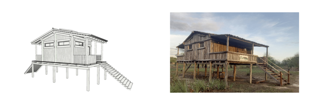 Bruno Barras venne ad Asuncion. Ci vedevamo in una caffetteria. Lui parlava ed io prendevo nota, abbozzavo schizzi e passavo tutto a Camilla. Il progetto prese forma partendo dalla pianta di una abitazione tradizionale, posta su palafitte, per renderla visibile, e con due porte una per l’entrata e l’altra per l’uscita dal piccolo percorso museale. Per fondamenta e pavimenti pali e tavole di quebracho, legno tropicale durissimo. Per tetto e pareti caranday, palma del Chaco. José Zanardini ci aiutava a interpretare le indicazioni spesso cifrate di Bruno Barras. Calixto seguiva i lavori.