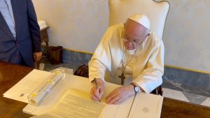 Papa Francesco per primo firma il Manifesto “Dignitas Curae” (Foto dell’autore)