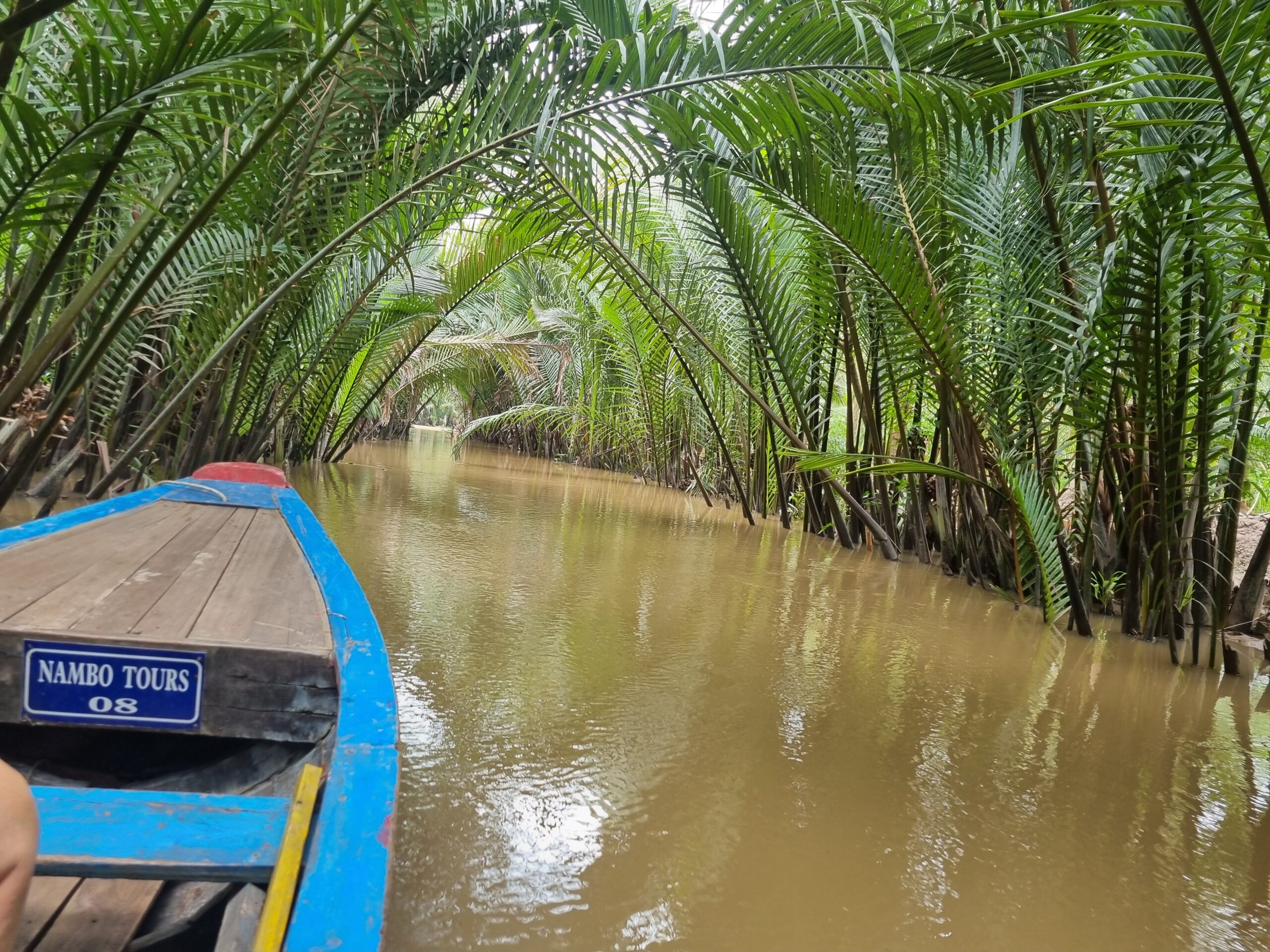 L’indomani si riparte da Saigon alla volta di Ben Tre, a due ore di auto, sul delta del Mekong. Un fiume che corre per 4.180 chilometri, che attraversa Cina, Birmania, Laos, Thailandia e Cambogia, prima di entrare in Vietnam. Scesi dalla macchina si va al molo. Saliamo su un’imbarcazione tipica e si salpa nel labirinto d’acqua che si apre davanti a noi, alla scoperta dei luoghi e delle attività che vi si svolgono intorno all’ enorme distesa acquatica, attraversata continuamente da imbarcazioni grandi e piccole, circondata da una vegetazione fittissima e ricca di frutti tropicali; scendiamo e visitiamo la fornace di mattoni prodotti ancora (per poco) in forma tradizionale; un laboratorio artigiano di cocco, dove il frutto viene utilizzato nella sua interezza, dalla polpa bianca al guscio esterno verdastro a quello legnoso e scuro, per diverse lavorazioni, sino alla confezione- a mano- di caramelle e altri dolci, in molte forme, mentre risuonano melodie di musica tradizionale e vengono riproposti, per i turisti in visita, balli in costume. Poi trasbordiamo su una piccola barca a remi, condotta da una giovane donna con il tipico copricapo a cono, per addentrarci lungo un canale laterale, in mezzo alla fitta vegetazione di palme che si distendono a formare lunghe gallerie, mentre ai lati dei canali si alzano rigogliosi alberi di cocco. La guida ci racconta che durante le piene le strade vengono sommerse e la popolazione si muove lungo gli innumerevoli canali. Un po’ come a Venezia. Poi si torna al molo di An Thanh per rientrare a Saigon.