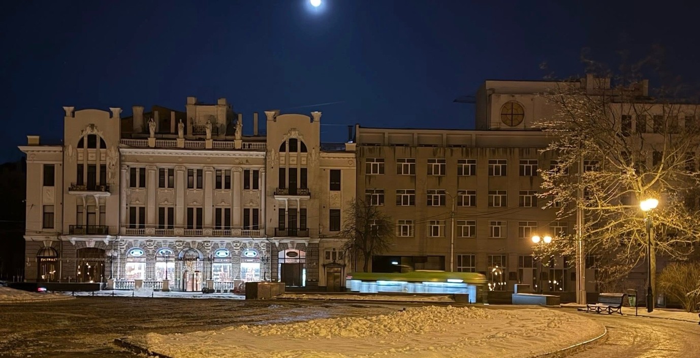 Sulla buia via Sumska scivola lentamente un autobus brillantemente illuminato, dall’aspetto inopportunamente festivo.